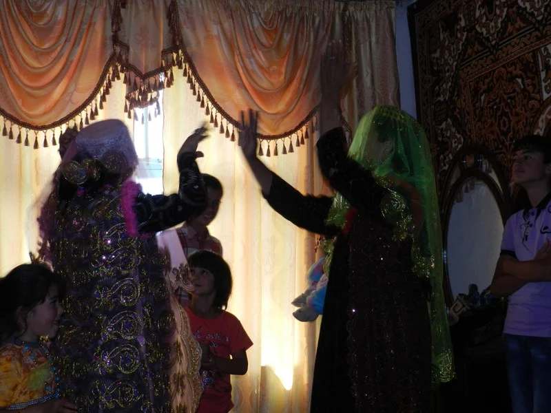 Yaghnobi women wearing colorful traditional clothing.