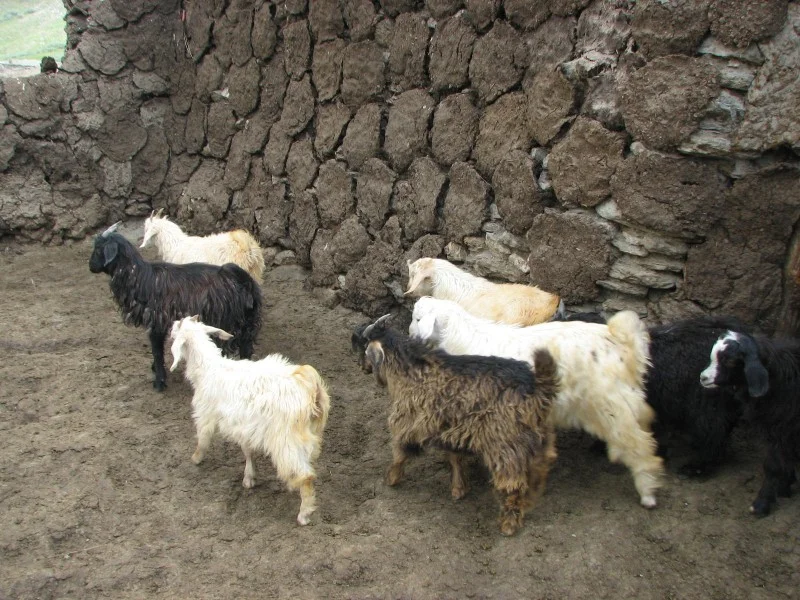 Goats in their stone enclosure, essential for wool and milk.
