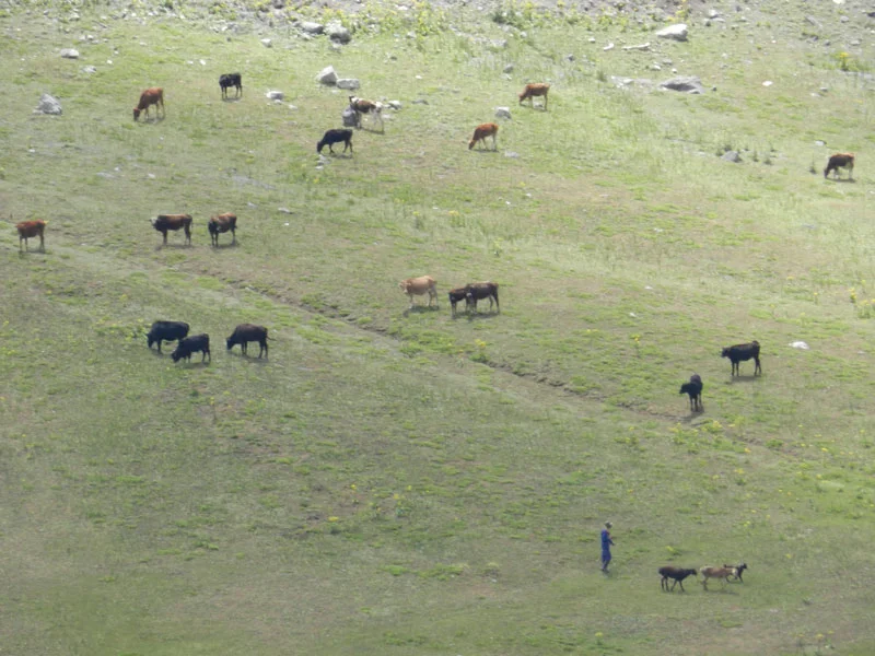 Cattle grazing on the high mountain slopes of the Yaghnob Valley.